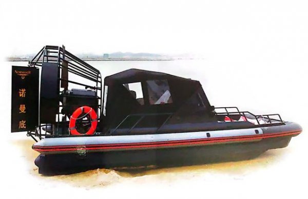 船體采用pvc為主體,外覆防彈材料。美國進口300HP發動機、碳纖維螺旋槳、減速箱,船底用高性能耐磨復合材料。